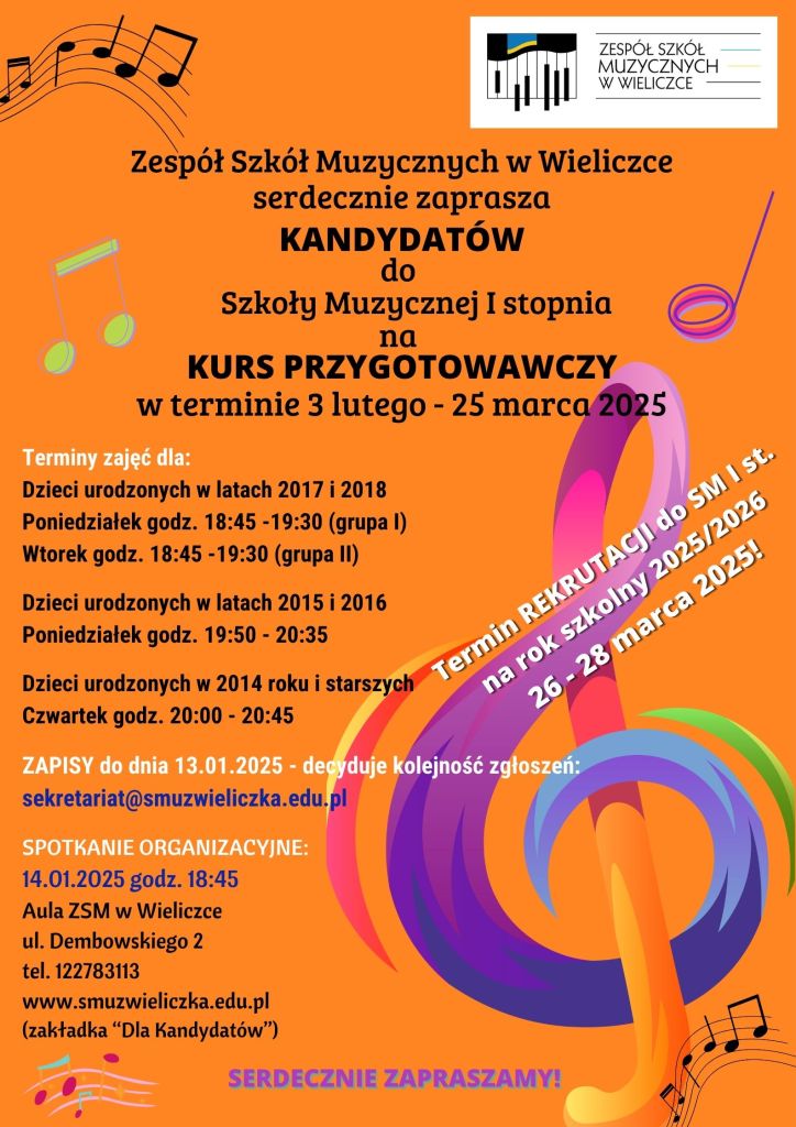 Zapraszamy na kurs przygotowawczy dla kandydatów do Szkoły Muzycznej I stopnia - zajęcia rozpoczną się 3 lutego 2024 r. i będą trwały do 25 marca 2025 r. - szczegóły znajdą Państwo na poniższym plakacie.