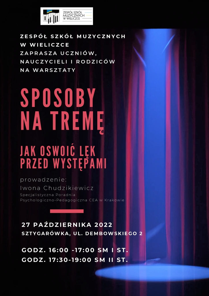 Serdecznie zapraszamy wszystkich Uczniów, Nauczycieli i Rodziców na warsztaty zatytułowane "Sposoby na tremę. Jak oswoić lęk przed występami", które odbędą się 27 października 2022 roku w Auli "Sztygarówka".