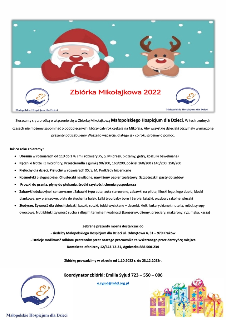 W dniach 5 - 19 grudnia Samorząd Uczniowski organizuje w szkole świąteczną zbiórkę na rzecz hospicjum dziecięcego. Szczegóły są dostępne na plakacie.