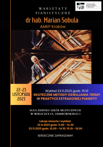 W dniach 22 - 23 listopada 2023 odbędą się w naszej Szkole warsztaty pianistyczne z dr hab. Marianem Sobulą, pianistą koncertującym na całym świecie, na co dzień związanym z Akademią Muzyczną im. Krzysztofa Pendereckiego w Krakowie.