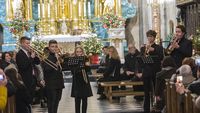 Kwintet Dęty: Jan Gałoński, Leon Gawlik – trąbki, Gabriela Kwiecińska, Maksymilian Półtorak, Igor Piątek - puzony, przygotowany przez pedagogów Pawła Gajewskigo i Arkadiusza Bałę, radosnym brzmieniem wprowadził wielicką publiczność w kolędowy nastrój.